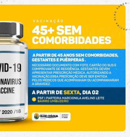 A Nova Etapa de vacinação no município de Olho D'água terá como grupos prioritários pessoas com idade a partir dos 45 anos que NÃO APRESENTEM COMORBIDADES, gestantes e puérperas.
