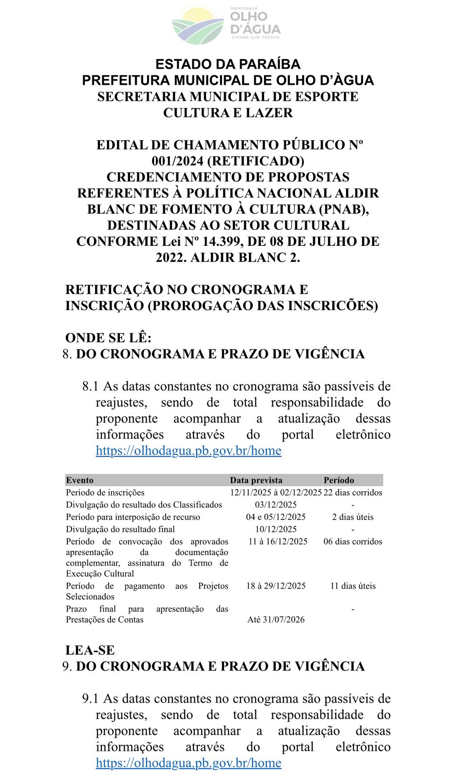 A Prefeitura Municipal de Olho D’Água, por meio da Secretaria de Esporte, Cultura e Lazer, informa que as inscrições para o Edital de Chamamento Público nº 001/2024, referente à Política Nacional Aldir Blanc de Fomento à Cultura (PNAB), foram prorrogadas até o dia 05 de dezembro de 2025.