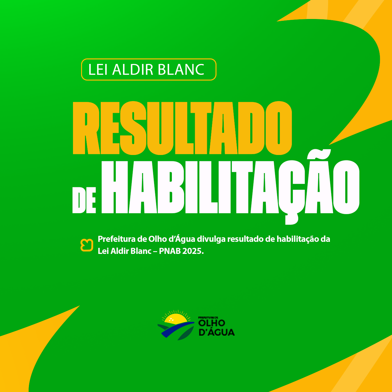 A Prefeitura Municipal de Olho d’Água, por meio da Secretaria Municipal de Esporte, Cultura e Lazer, torna público o resultado da habilitação do Edital de Chamamento Público nº 001/2025, referente ao credenciamento de propostas da Política Nacional Aldir Blanc de Fomento à Cultura (PNAB – Ciclo 2025).