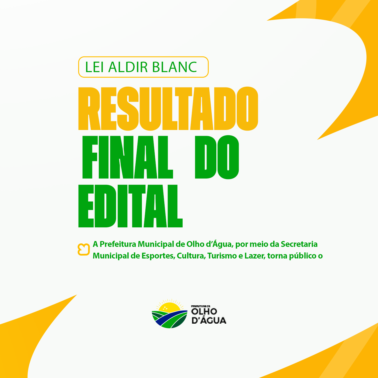 A Prefeitura Municipal de Olho d’Água, por meio da Secretaria Municipal de Esportes, Cultura, Turismo e Lazer, torna público o resultado final do Edital de Chamamento Público nº 001/2025, referente à Política Nacional Aldir Blanc de Fomento à Cultura (PNAB – Ciclo 2025).