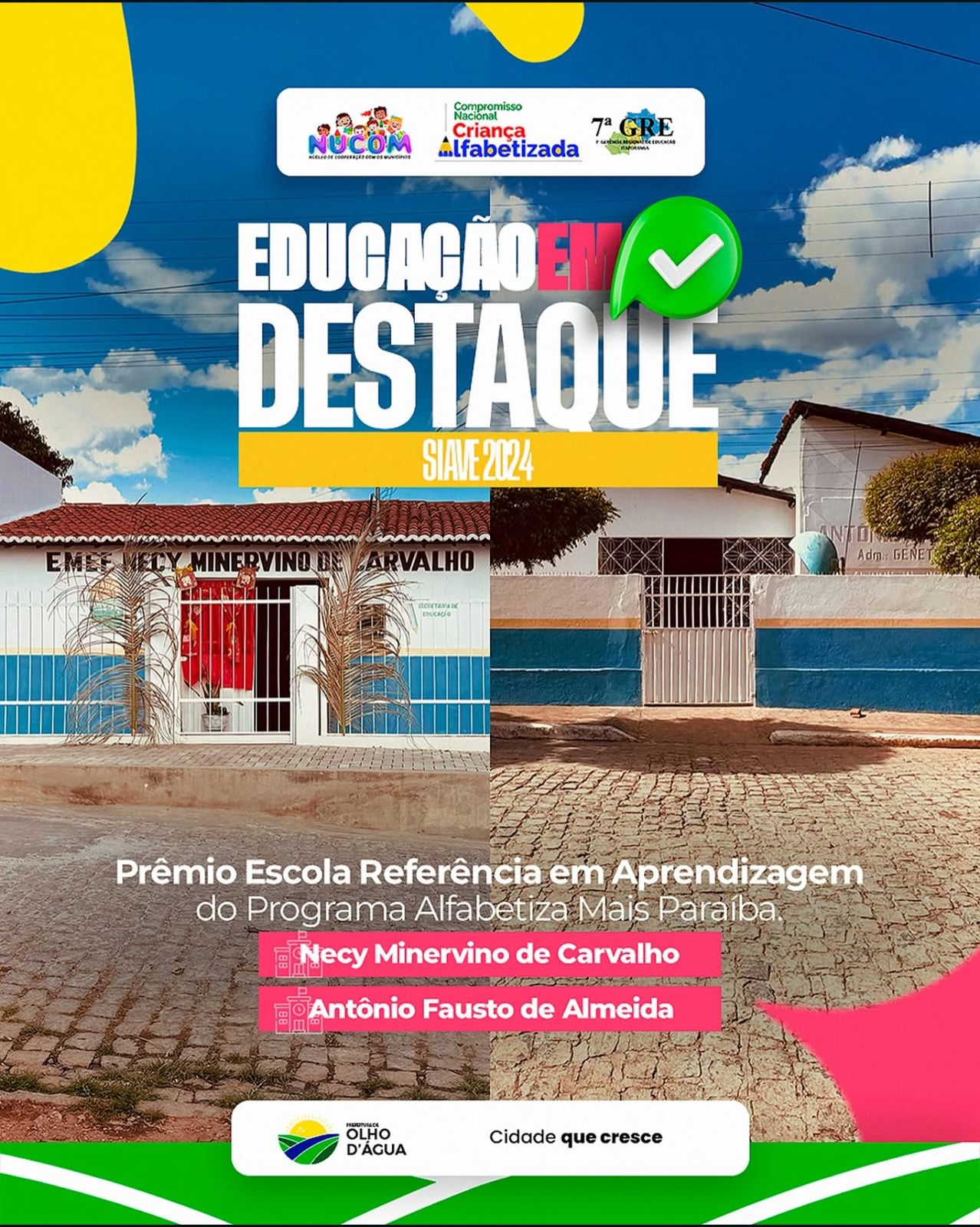 A educação de Olho D’Água segue avançando e alcançando novos patamares! O município recebeu o Selo Estadual de Referência em Aprendizagem, reconhecimento concedido às cidades que demonstram compromisso e resultados efetivos na qualidade do ensino. Entre os 53 municípios paraibanos premiados, Olho D’Água se destaca pelo trabalho contínuo em prol do desenvolvimento educacional.