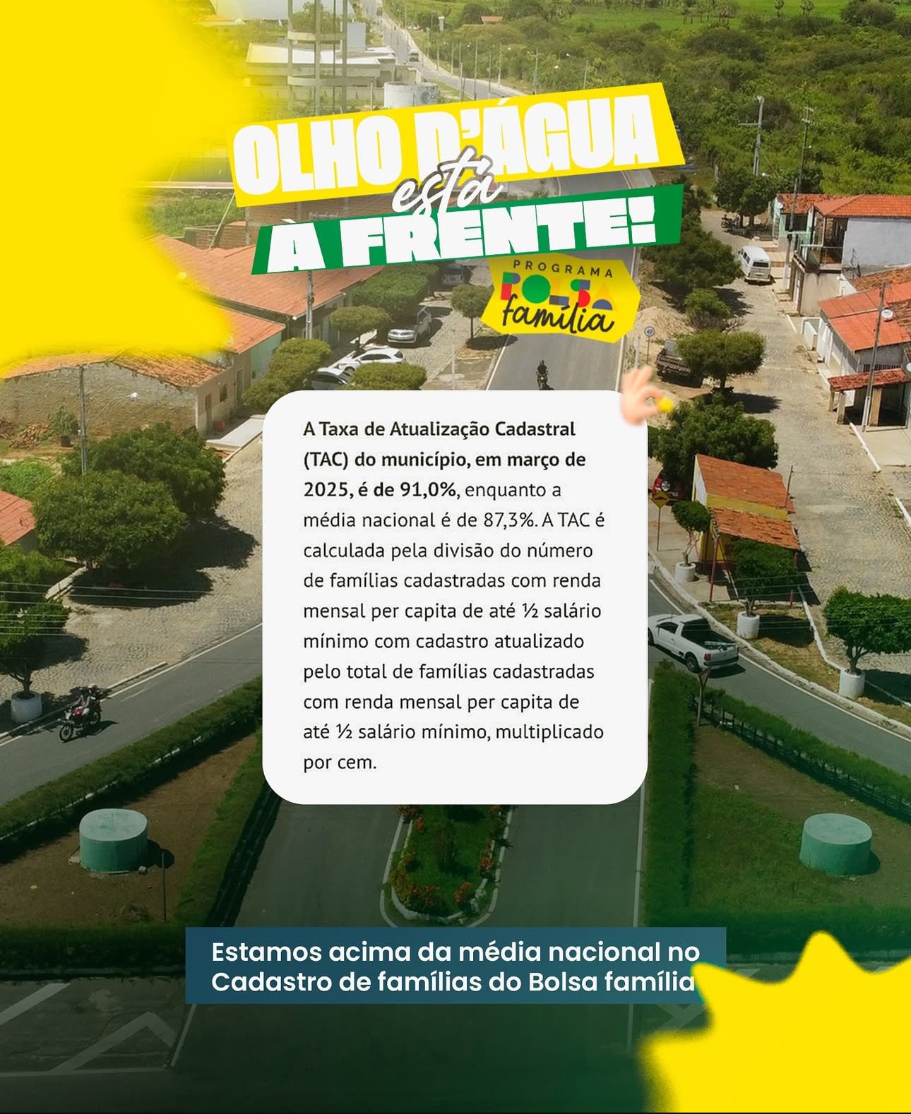 O município de Olho D’Água segue demonstrando compromisso e responsabilidade com as famílias que mais precisam. Em março, a cidade alcançou 91,0% de atualização cadastral do Programa Bolsa Família, índice que supera a média nacional e reforça o trabalho eficiente desenvolvido pela gestão municipal.