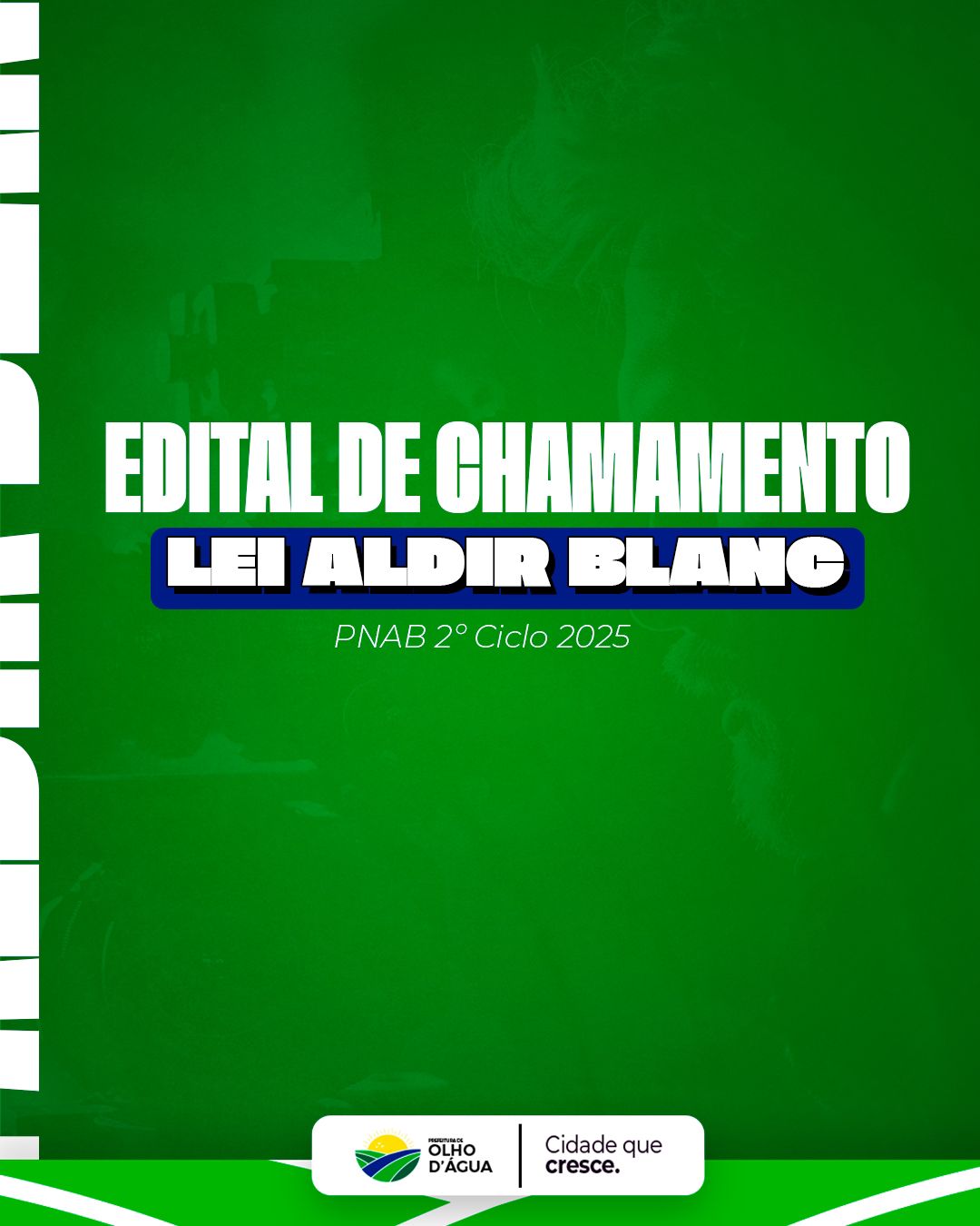 A Prefeitura Municipal de Olho D’Água, por meio da Secretaria Municipal de Esporte, Cultura e Lazer, torna público o Edital de Chamamento nº 001/2025, destinado ao credenciamento de 40 projetos culturais individuais ou coletivos, conforme a Política Nacional Aldir Blanc de Fomento à Cultura – PNAB (Lei Federal nº 14.399/2022).