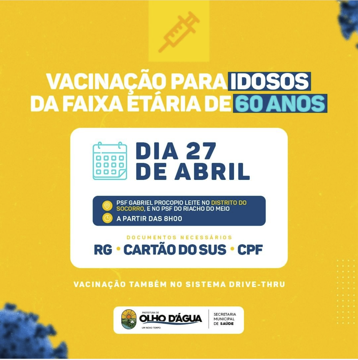 A Prefeitura Municipal de Olho D'água através da Secretaria de Saúde informa sobre a vacinação de idosos da faixa etária de 60 anos, que será realizada no dia 27 de Abril, a partir das 8h00 no PSF Gabriel Procopio Leite no Distrito do Socorro e no PSF do Riacho do Meio.